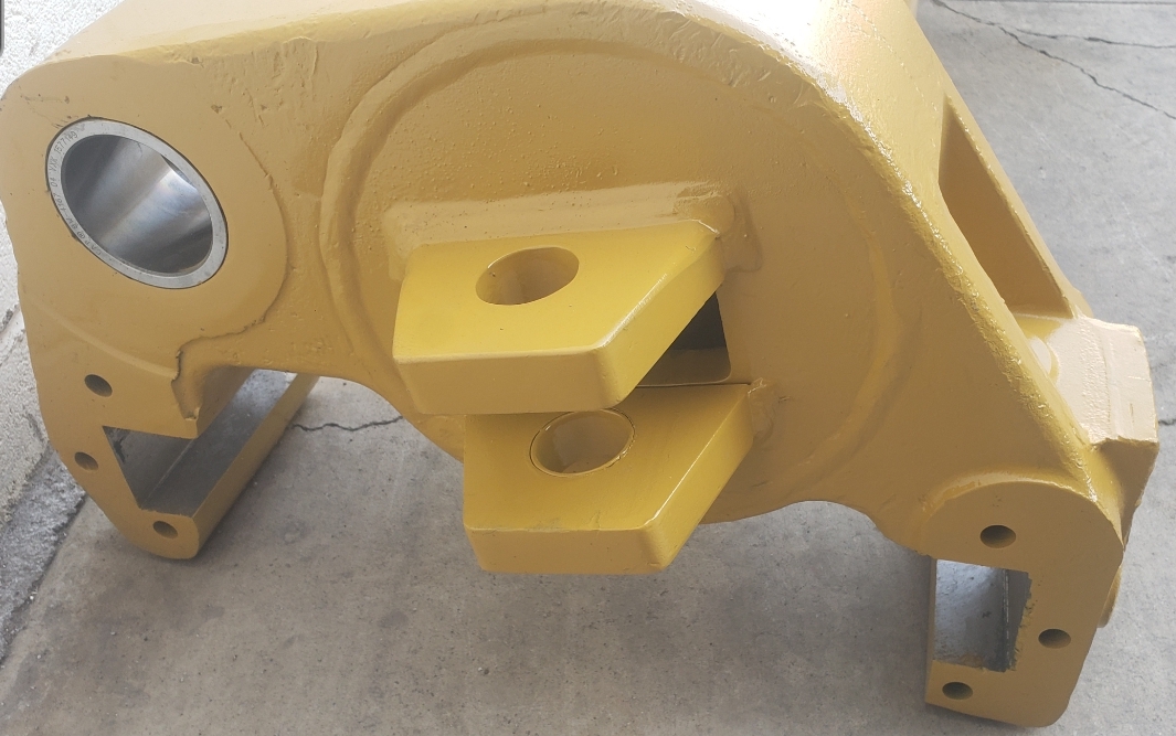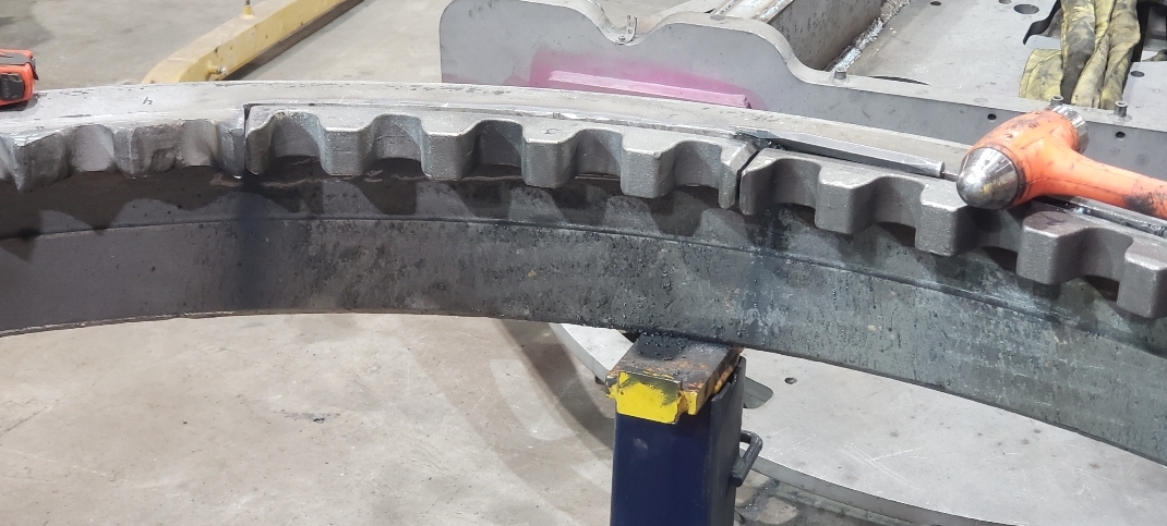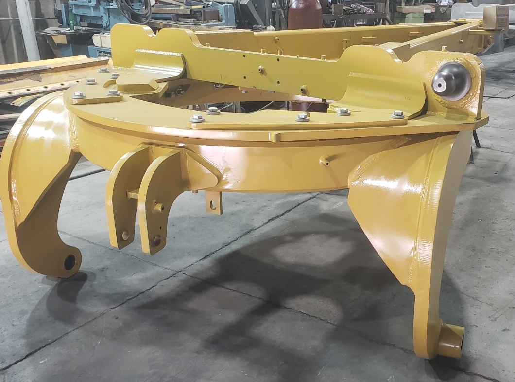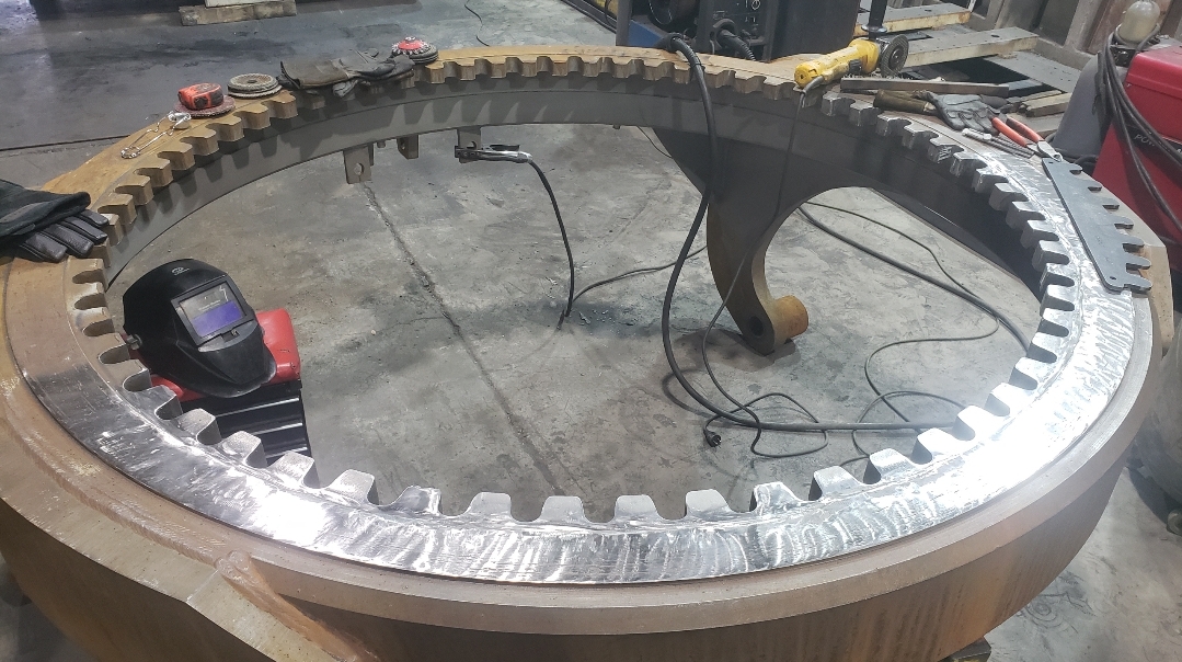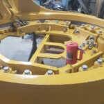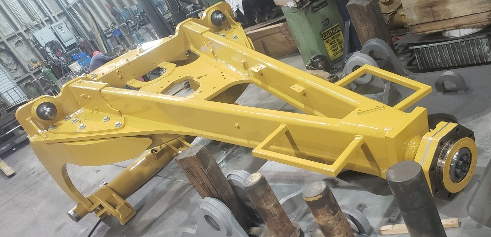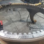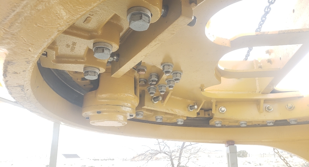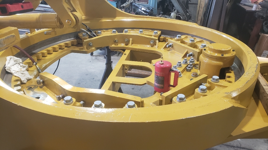 Here are some pics of a Caterpillar 18M3 grader circle, drawbar table and moldboard blade hanger bracket we did a complete repair & rebuild to. The main beams on the drawbar table were both cracked all the way through. We cut the main beams off, straightened the table & welded new beams in place. The circle drive motor was completely rebuilt with a new pinion gear, splined mainshaft, worm gear & clutch pack. The circle assembly had several teeth worn down to a point so we cut the bad teeth out & welded in six new segments of teeth. The moldboard blade hanger bracket was worn in the bores as well as the rectangle slots where the brass shims seat that the moldboard/blade slide in. So we machined the bores true & round & the rectangle slots true, flat & square. We then welded the bores & the surfaces of the rectangle slots up & then machined them back to spec. After we got the complete assembly all put back together we connected it to our hydraulic setup to test run all its functions to ensure it operates smoothly & as it should. We are here & ready for all your heavy equipment parts repair, welding, boring, machining & rebuilding needs.