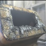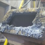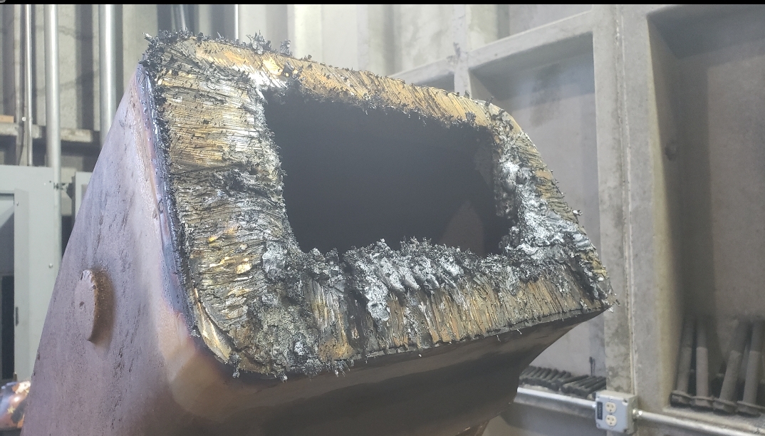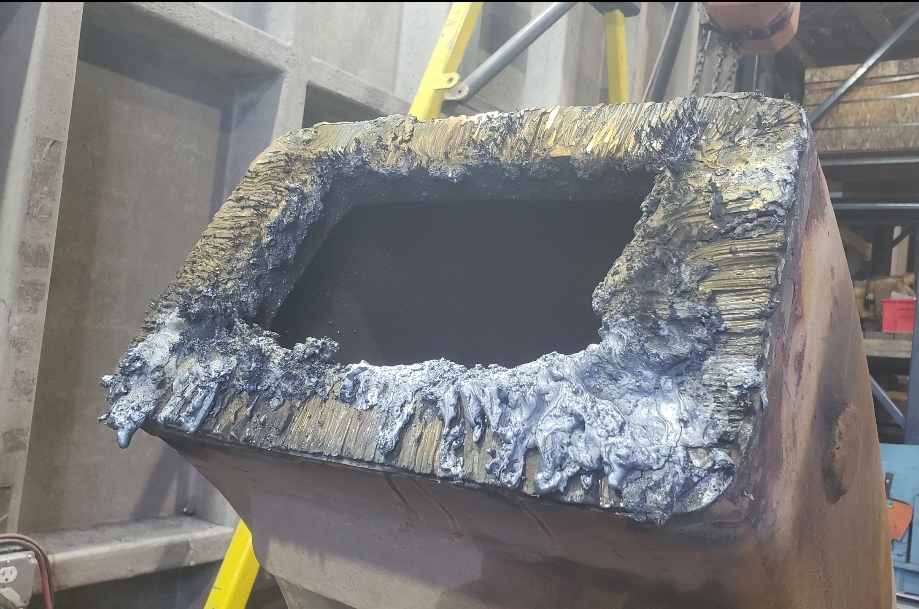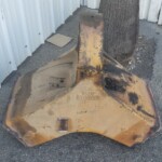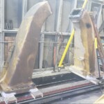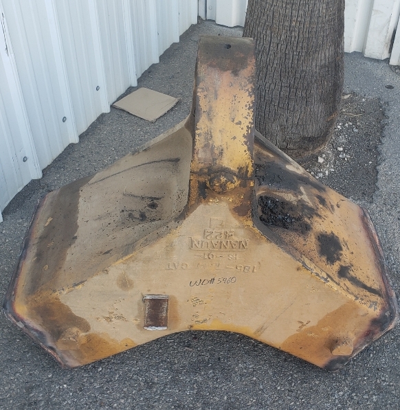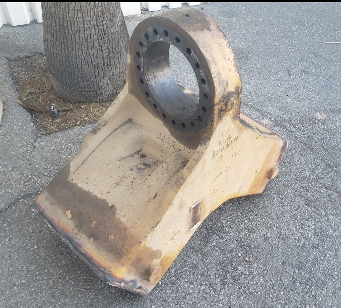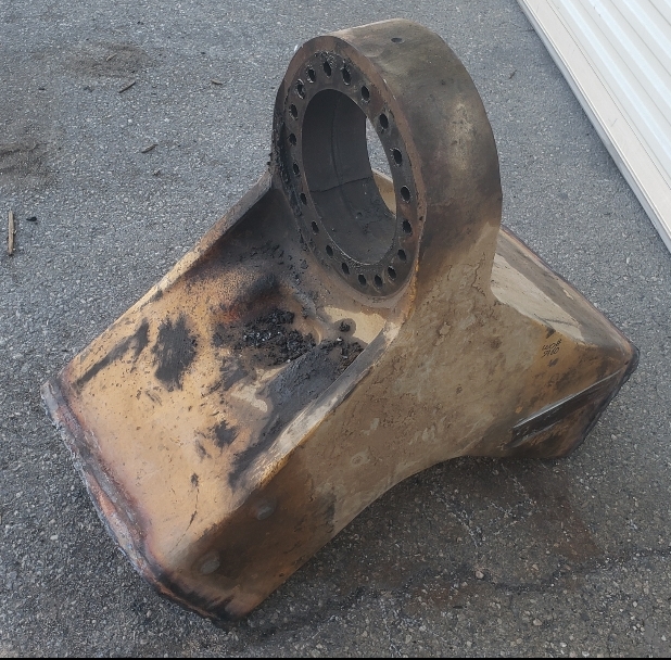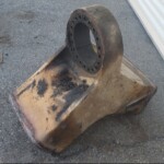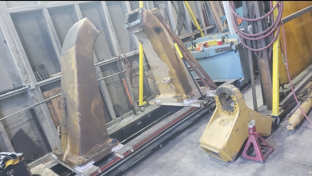 Here are some pics of a Caterpillar 793C haul truck rear axle a-frame support we repaired. The bore in the end of the A-Frame Support was worn & cracked into the bolt holes. Since machining & welding the hitch pin bore was out of the question we air arced (Air Carbon Arc Gouging) the yoke off of the A-Frame support legs. We then welded a new #229-7378 yoke to the legs of the support. It’s a bit tricky getting the yoke all welded in place without the legs moving around & flexing due to the heat from welding. Our fixturing jig ensures we maintain the correct dimensions from the mounting pads of the legs to the centerline of the hitch pin bore & the bolt holes. The A-Frame Support now has a new hitch bore & ready for another round of service.