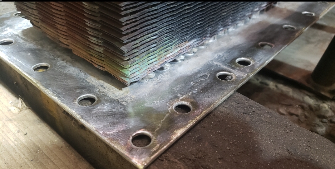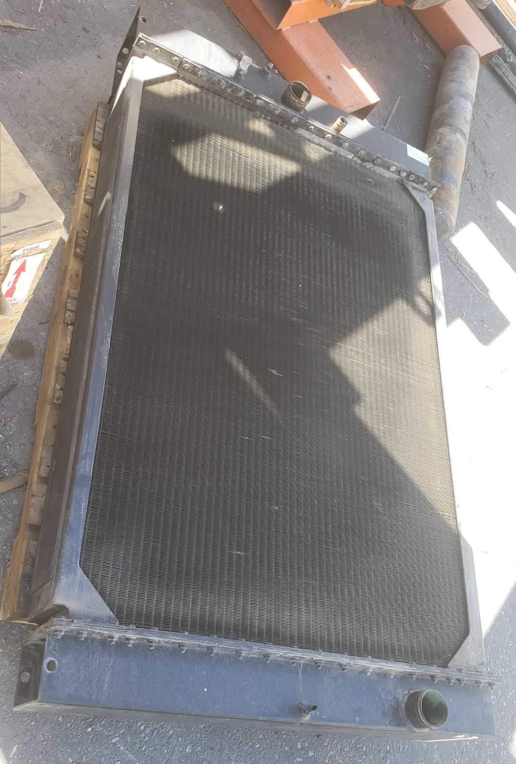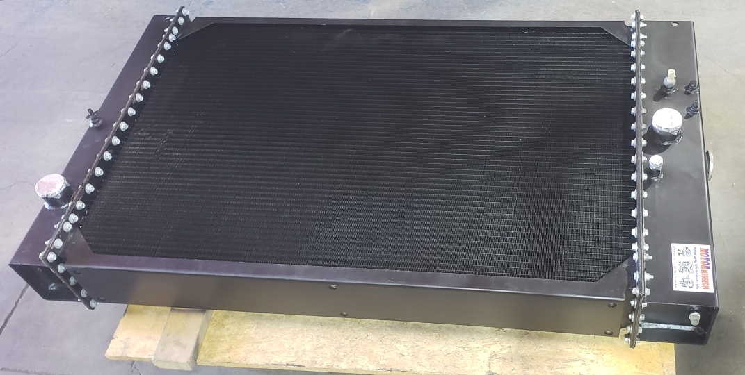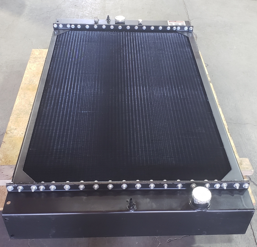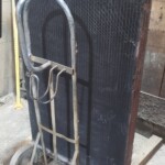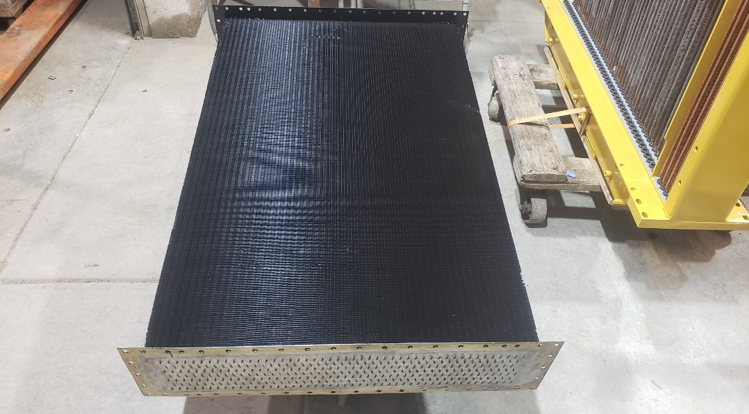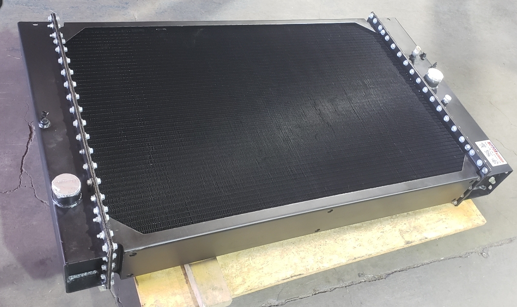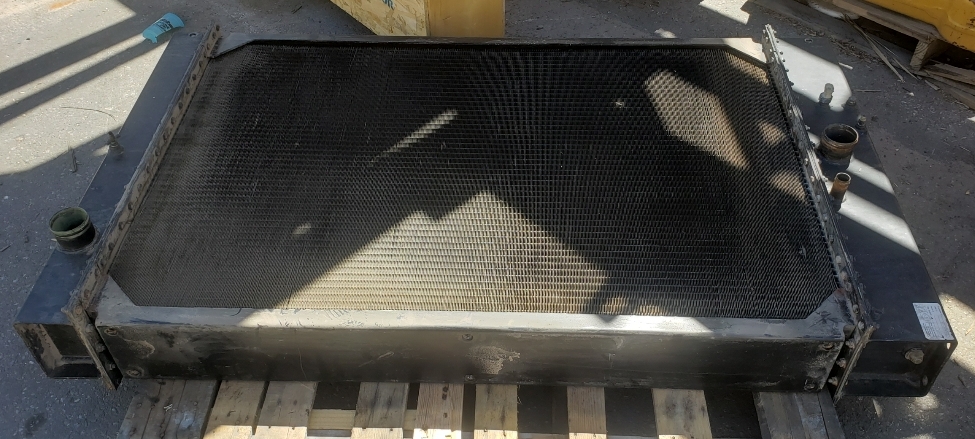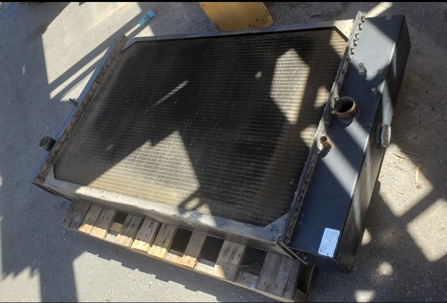 Here are some before & after pics of a 988 Caterpillar loader radiator we overhauled. The radiator came in for an overheating issue as well as a leak. We completely disassembled the radiator so we could rod out all of the canted tubes in the radiator core. The tanks & side braces got thermal cleaned & blasted. We made some new rubber impregnated cork gaskets to seal between the headers of the core & the radiator inlet & outlet tanks. A final pressure test insured that the radiator is leak free & ready for another round of service.