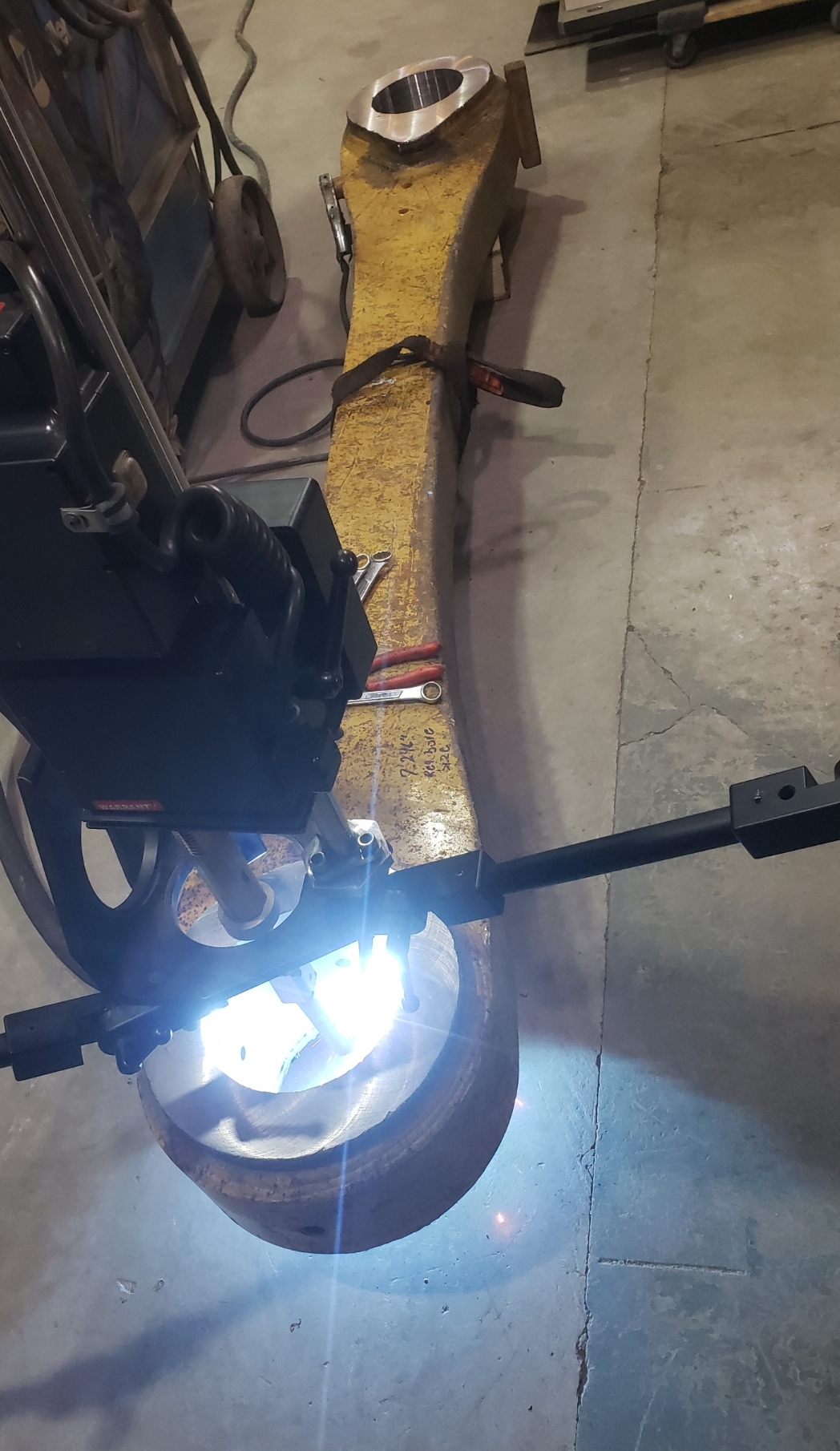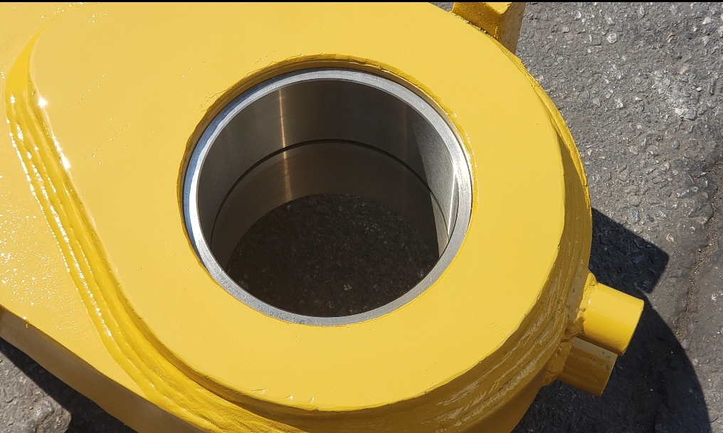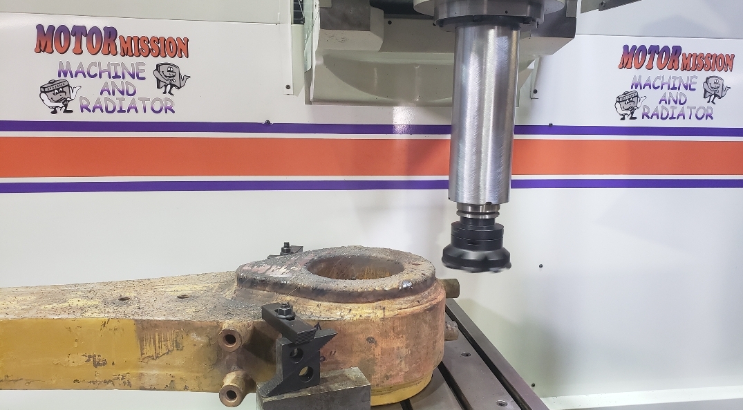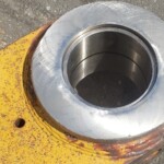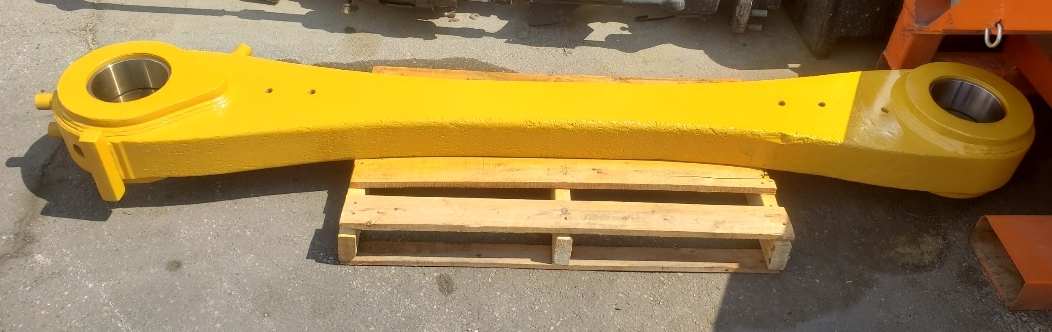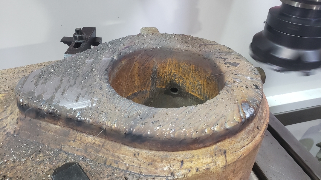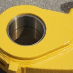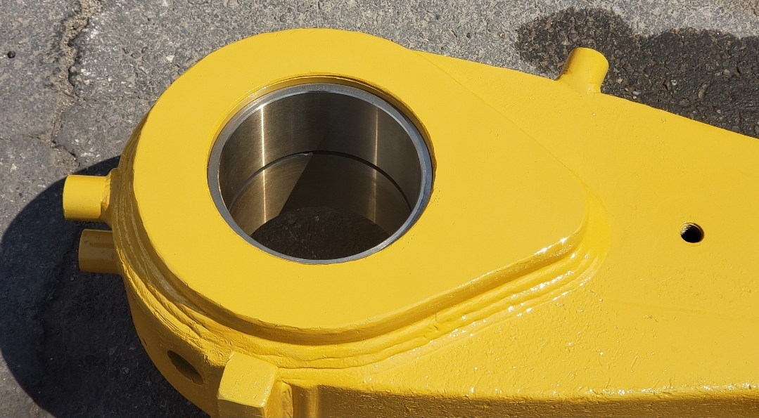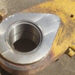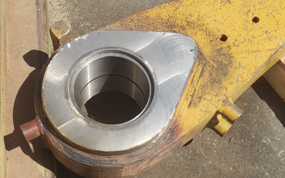 Here’s some pics of a Caterpillar 994H dogbone link that we repaired. The bores on both ends of the dogbone had to be machined, or bored, oversize. We then welded the bores with our automatic bore welding setup fixture. After the welding was done on the bores we then machined the bores back to the spec size for the installation of new bushings. The surfaces on both sides of each bore were also worn so they had to be machined down, welded back up & then surfaced, or milled, back to the correct thickness.