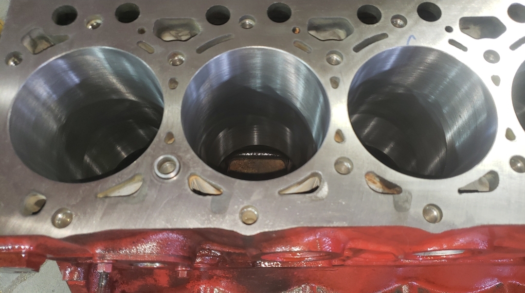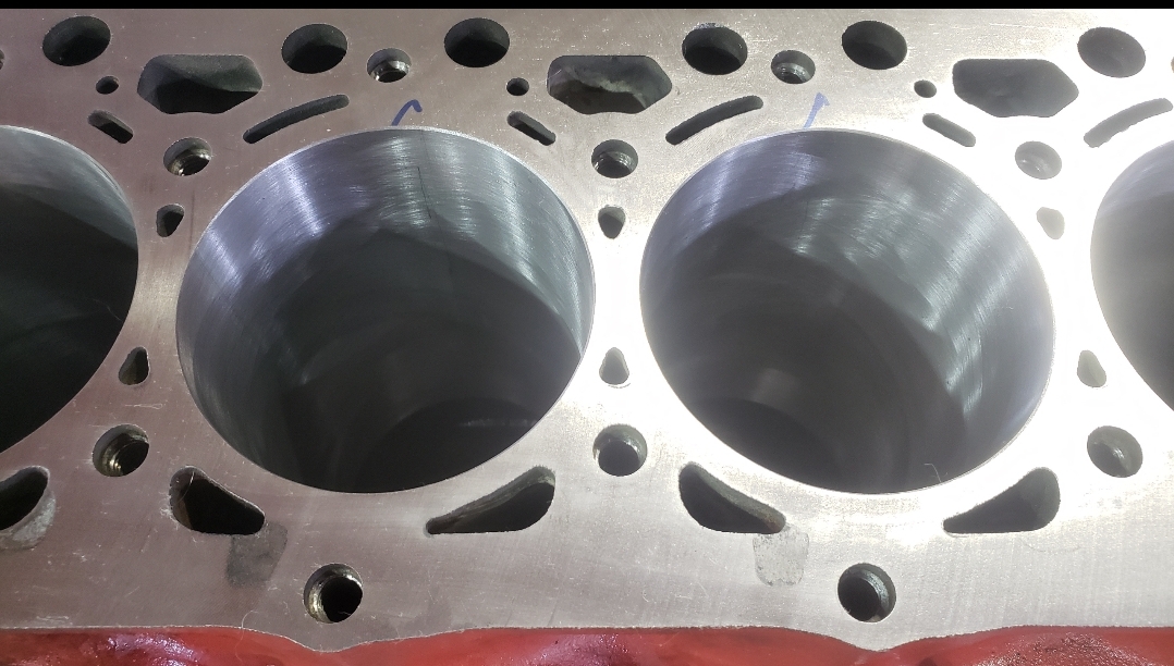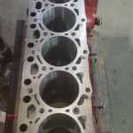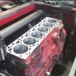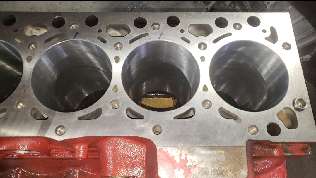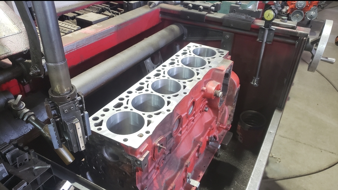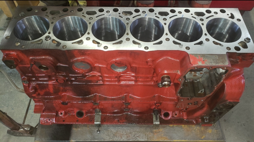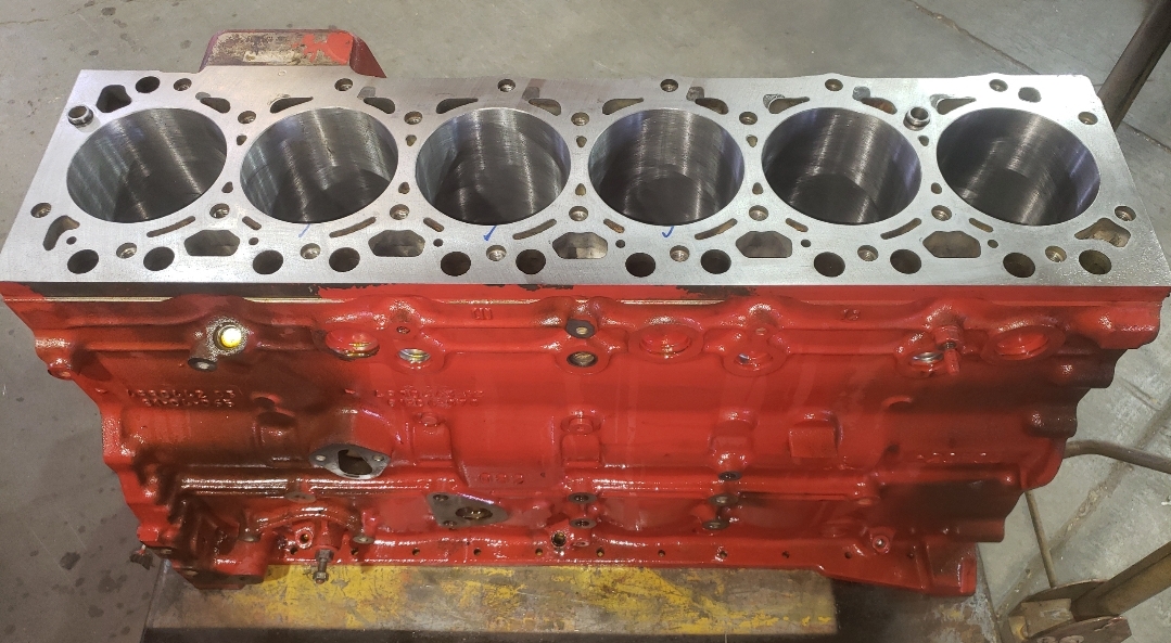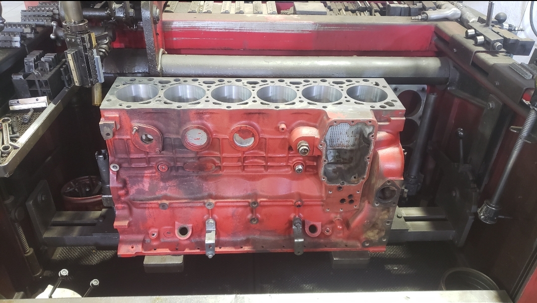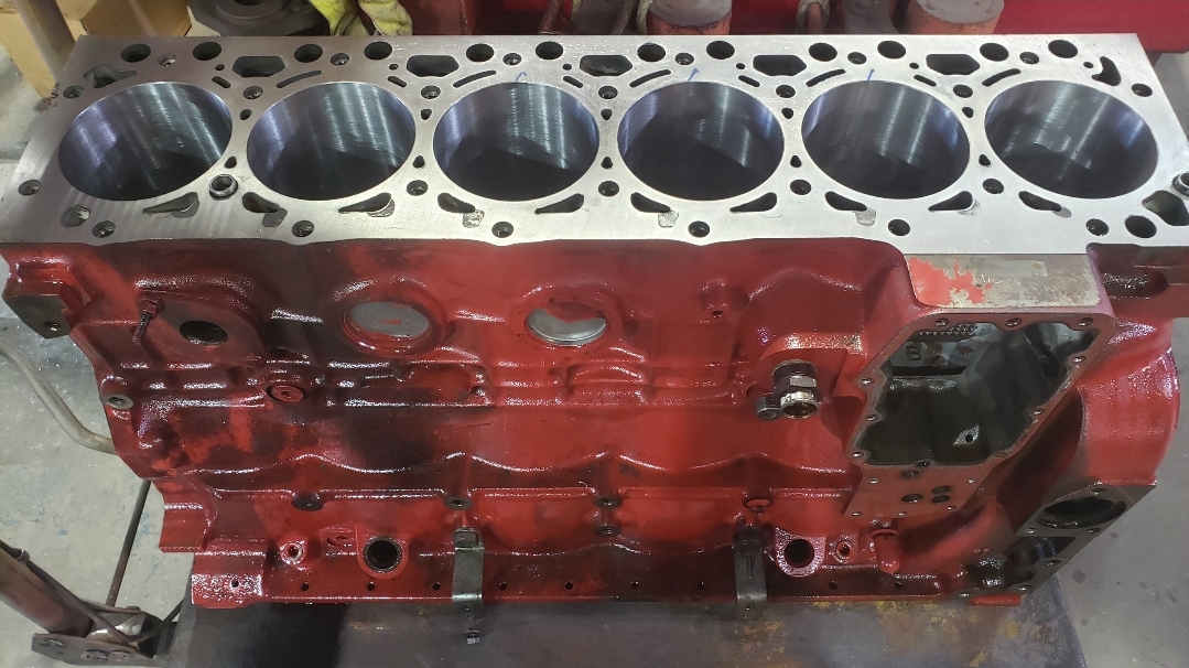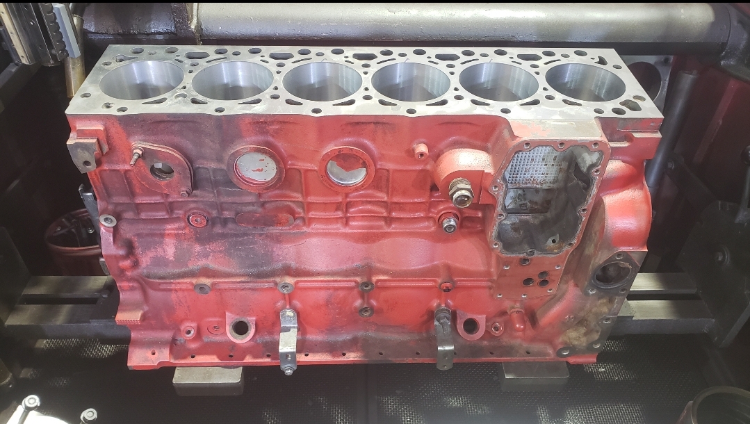 Here are some pics of a Cummins ISB 6.7 liter diesel engine block we had in for machining. The cylinders had some scratches & wear so we bored them oversize by .020 (twenty thousandths). The deck surface had some imperfections so we machined, or surfaced, the top of the block flat & square. We then mounted the block in our cylinder hone & installed a torque plate to simulate the cylinder head being installed on the engine. We finished the cylinders to size in the honing machine & brushed them to final size with plateau honing brushes. The cylinders & deck are all machined & the block is ready for assembly.