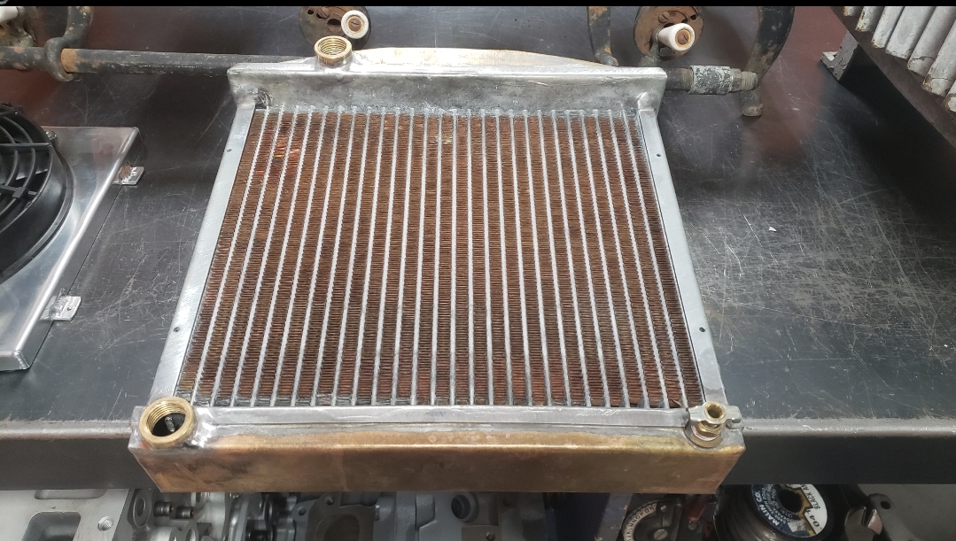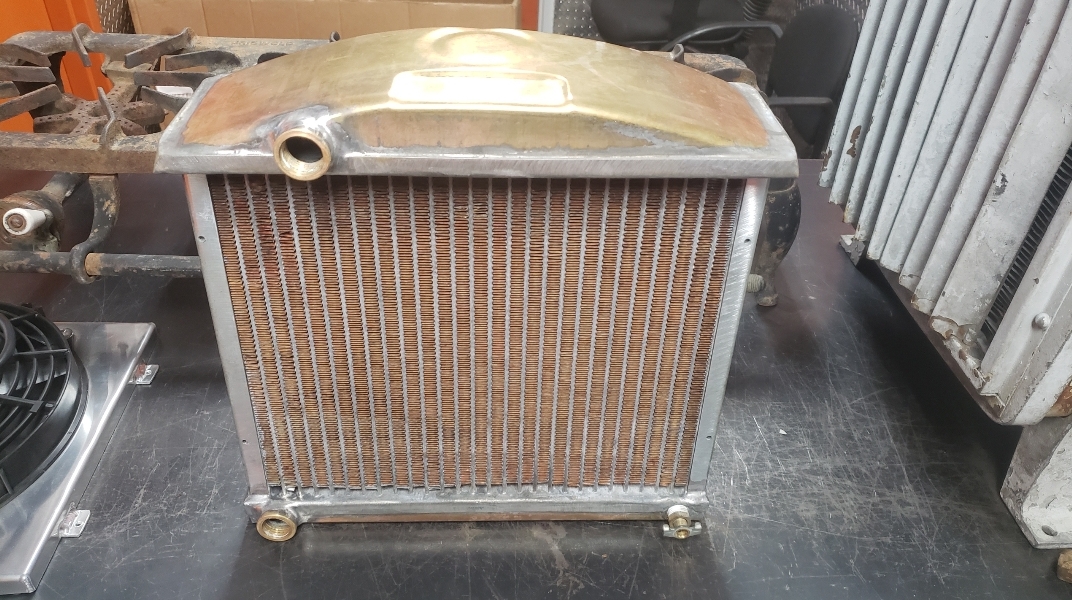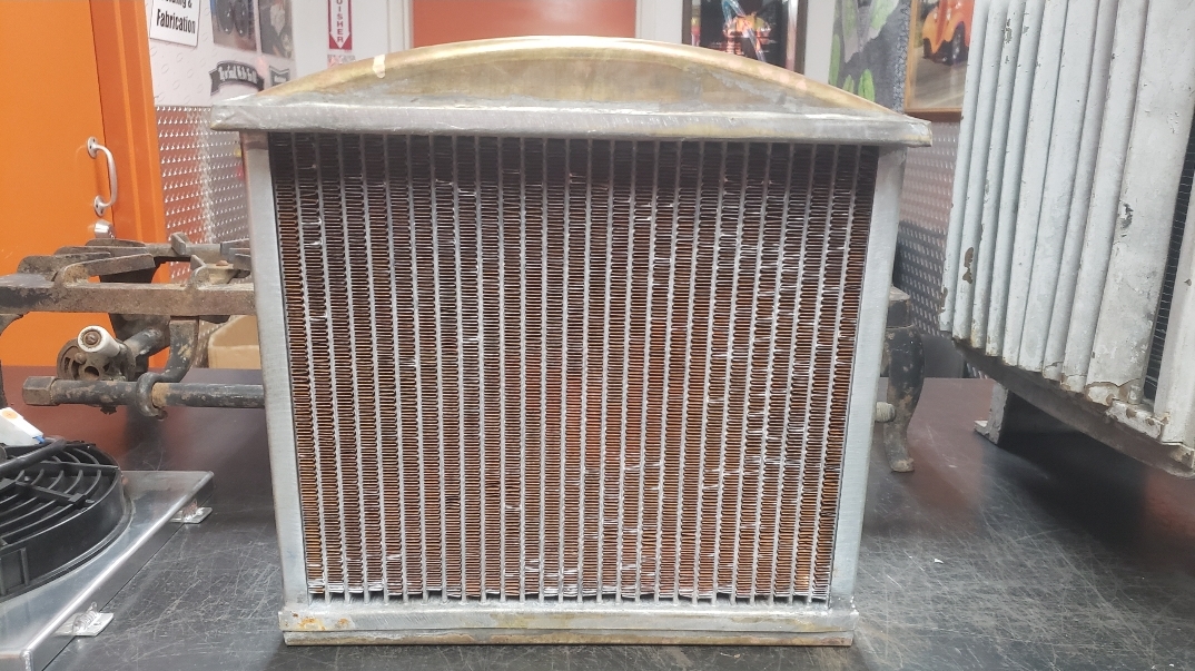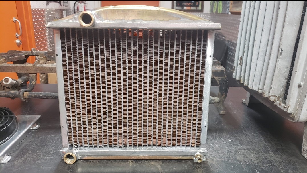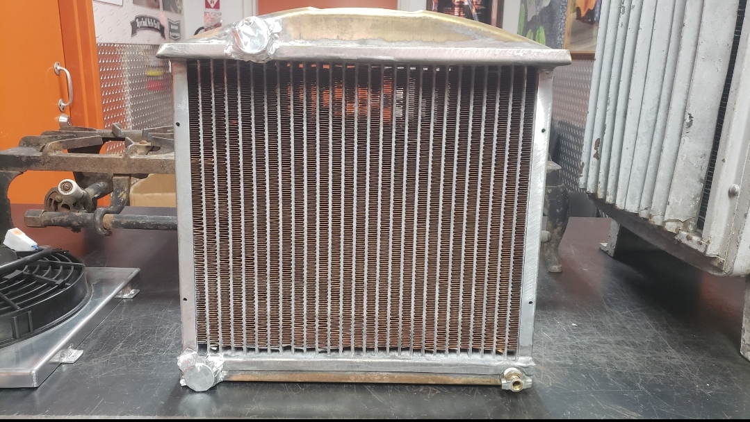 Here are some pics of a custom copper brass high efficiency radiator we completed for a rat rod. The radiator is small in order to fit where our customer has planned to install it. The radiator is basically an auxiliary heat exchanger which will be used for cooling the supercharger on the engine. The radiator was fitted with an aluminum fan shroud & a Spal electric fan. Our customer will be plumbing to the radiator with AN hoses & fittings which will plumb into the female pipe thread connections on the top & bottom tanks of the radiator. For all your custom radiator & heat exchanger needs don’t hesitate to contact us.