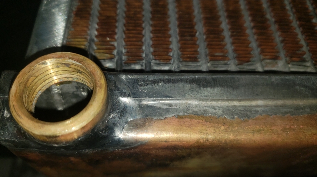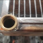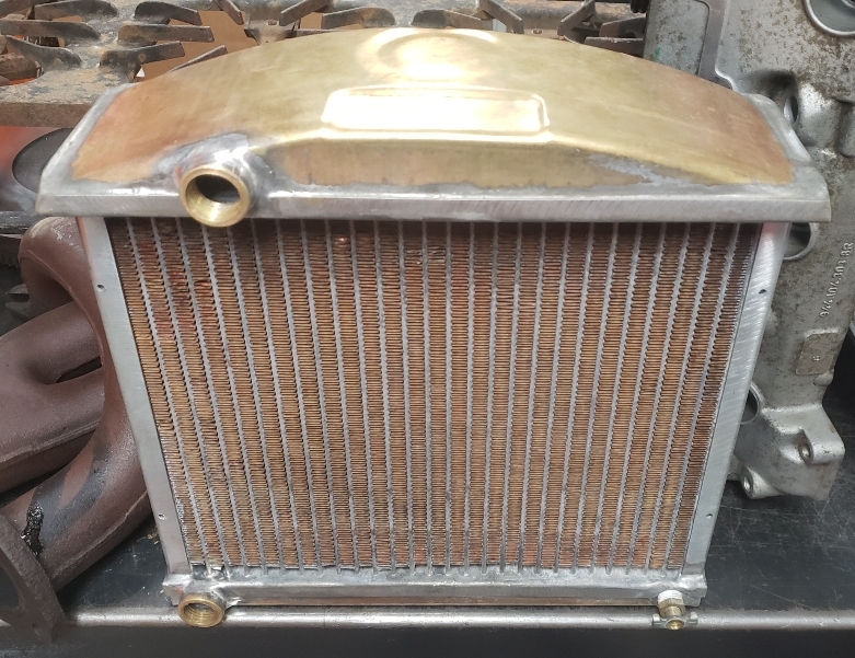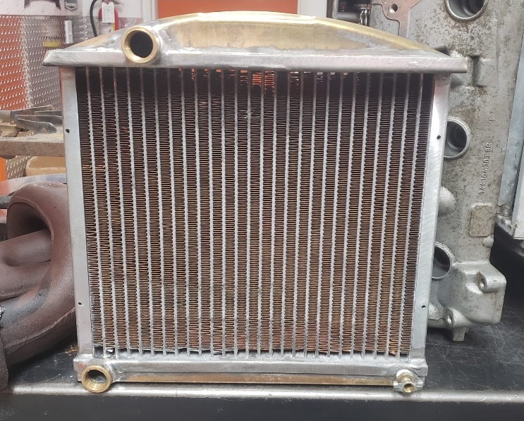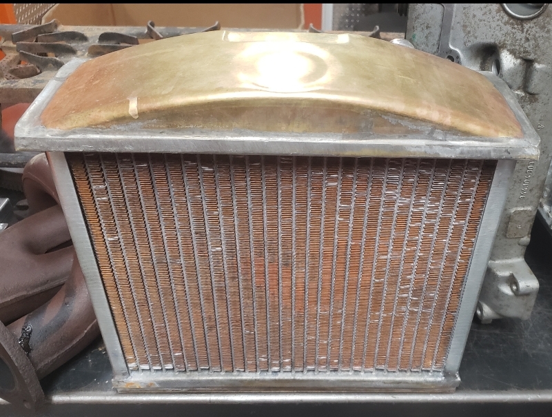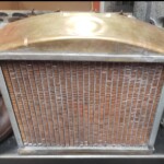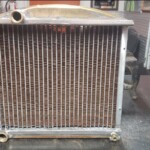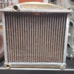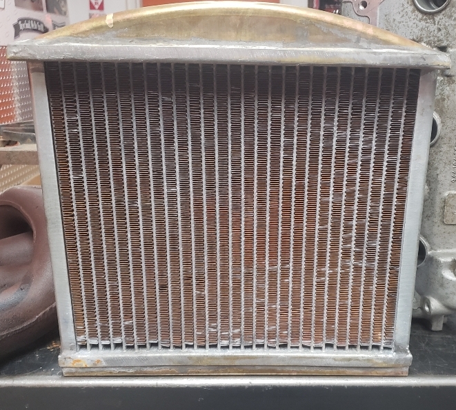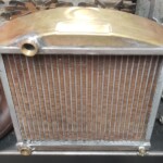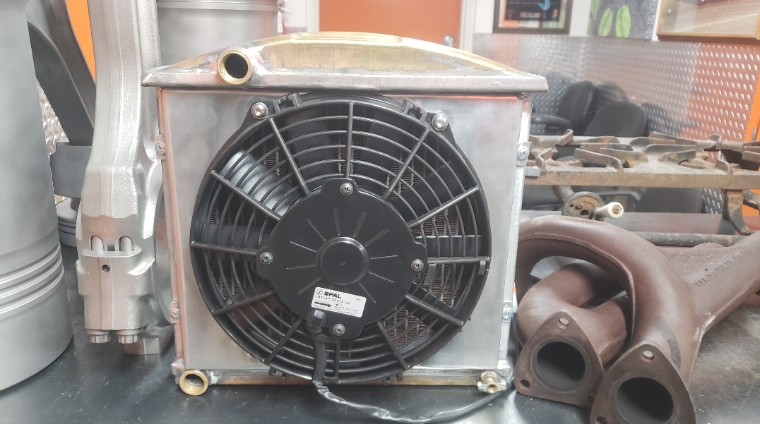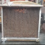Here are some pics of a custom copper brass high efficiency radiator we completed for a rat rod. The radiator is small in order to fit where our customer has planned to install it. The radiator is basically an auxiliary heat exchanger which will be used for cooling the supercharger on the engine. The radiator was fitted with an aluminum fan shroud & a Spal electric fan. Our customer will be plumbing to the radiator with AN hoses & fittings which will plumb into the female pipe thread connections on the top & bottom tanks of the radiator. For all your custom radiator & heat exchanger needs don’t hesitate to contact us.