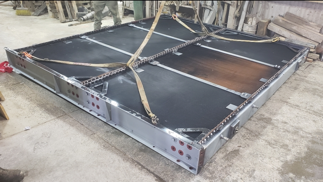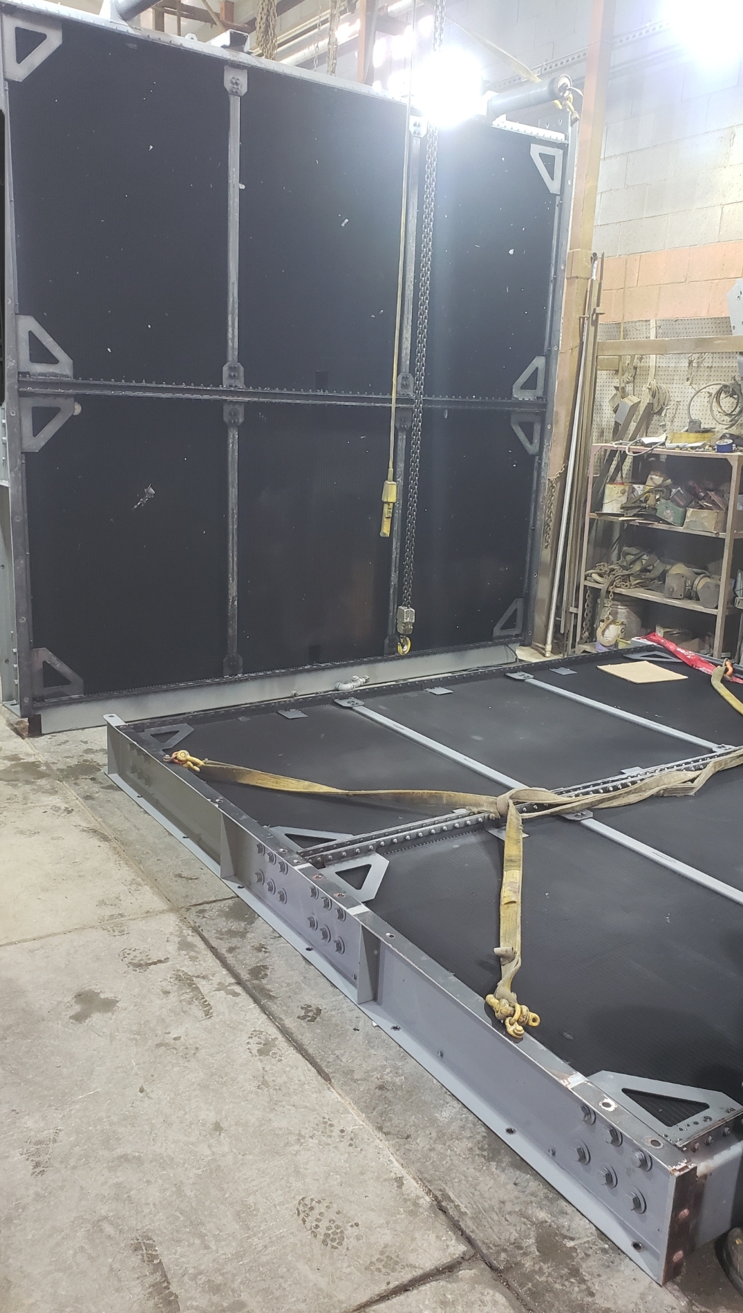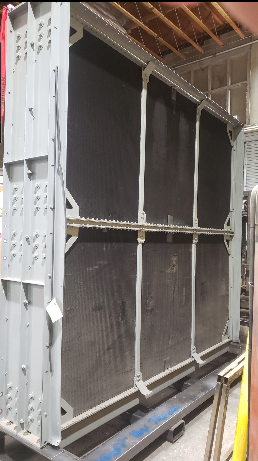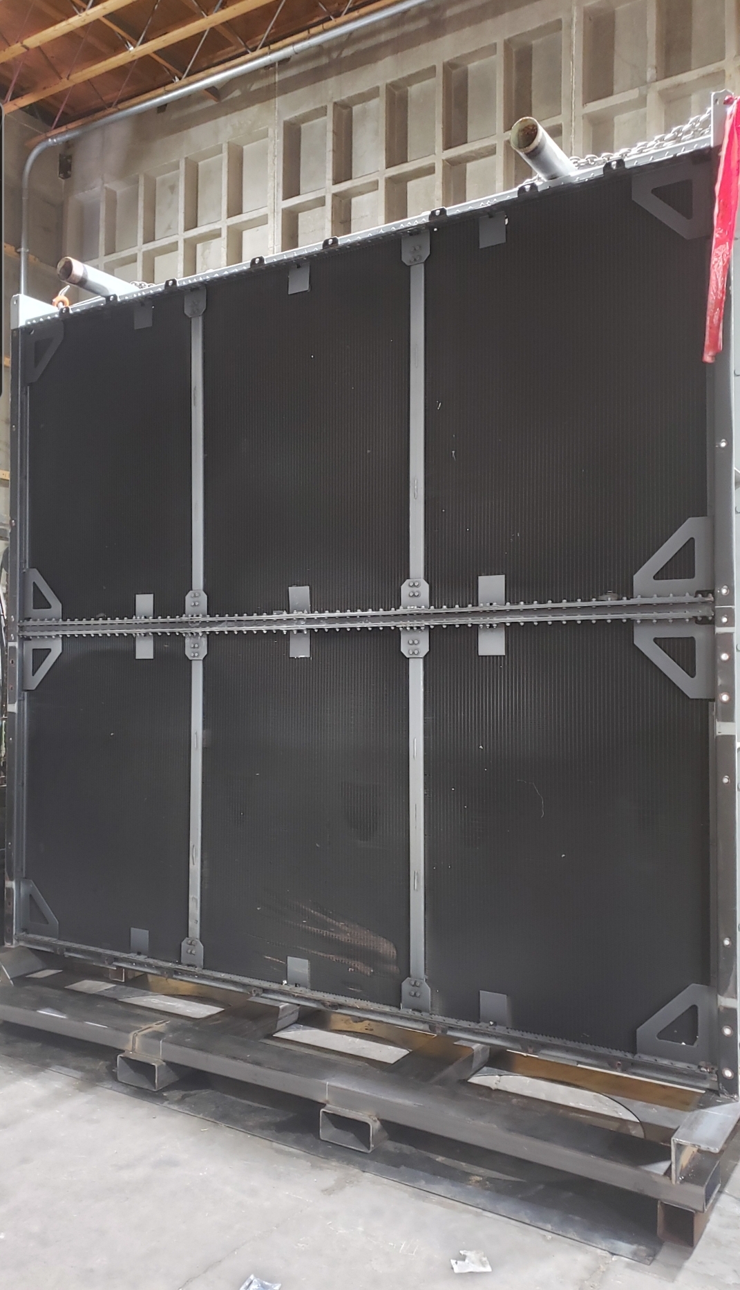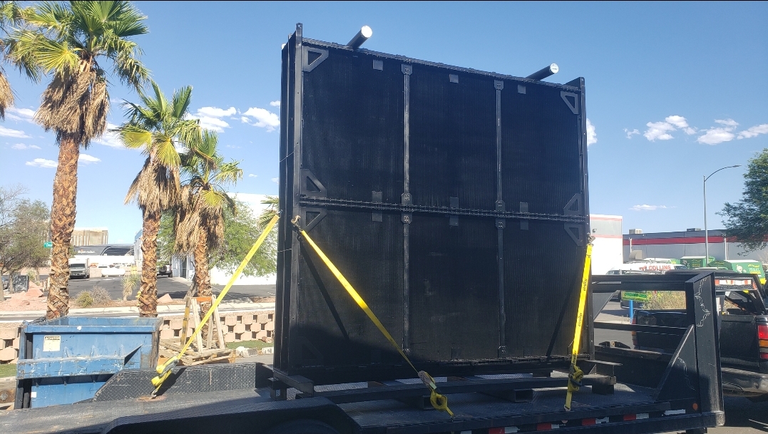 Here’s some pics of a large backup generator radiator we rebuilt. The radiator consists of a Hi-Temp & Lo-Temp Dual Radiator assembly. This radiator mates up to an MTU DS3250 standby generator which is powered by a V-20 diesel engine. Each radiator half is made up of six individual conventional radiator cores. That’s twelve total cores which is equivalent to rebuilding twelve semi truck radiators. Albeit each of these cores is a bit larger than the typical semi truck radiator. Each of the twelve cores received a rod & repair & extensive cleaning in our ultrasonic cleaning tanks. We delivered the radiator to the site of the generator where the crane lifted the radiator off of our stand & lowered it straight into the generator enclosure. We helped with the setting of the radiator & assisted with bolting it back in place.