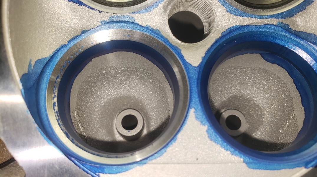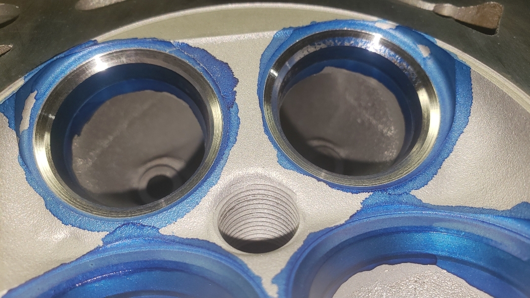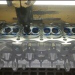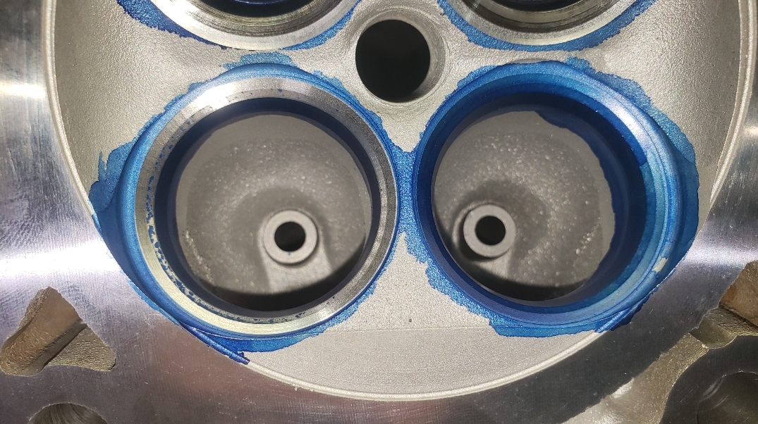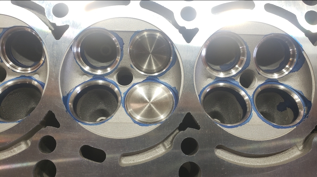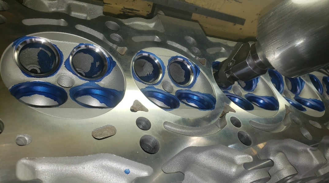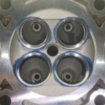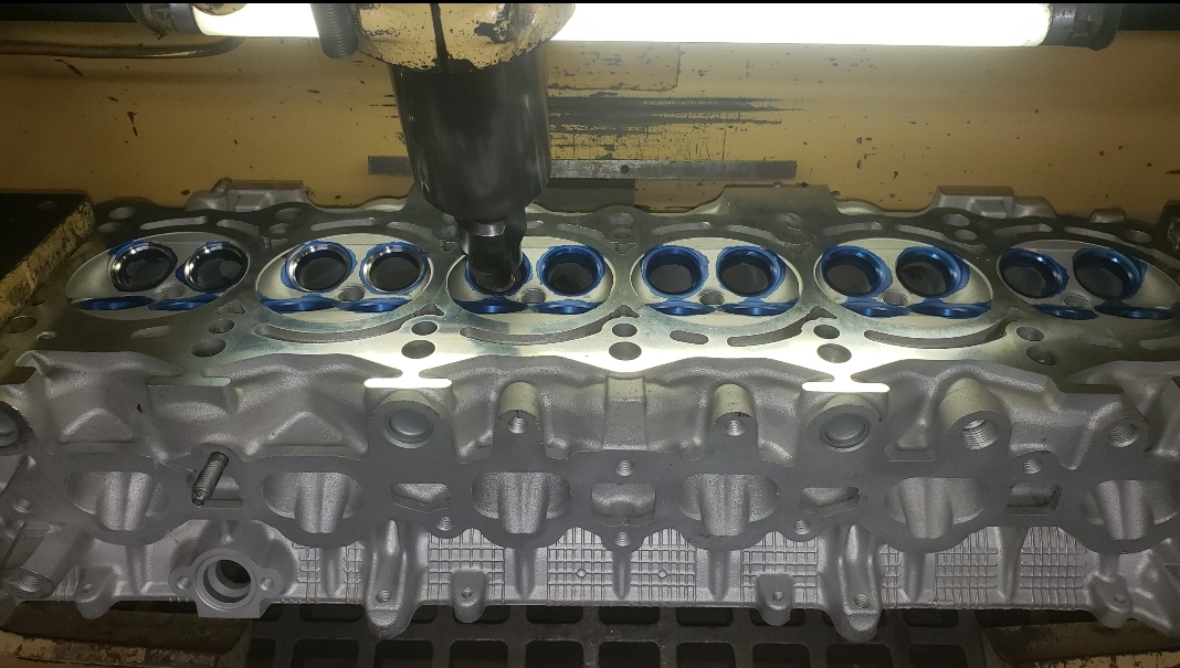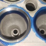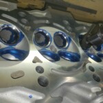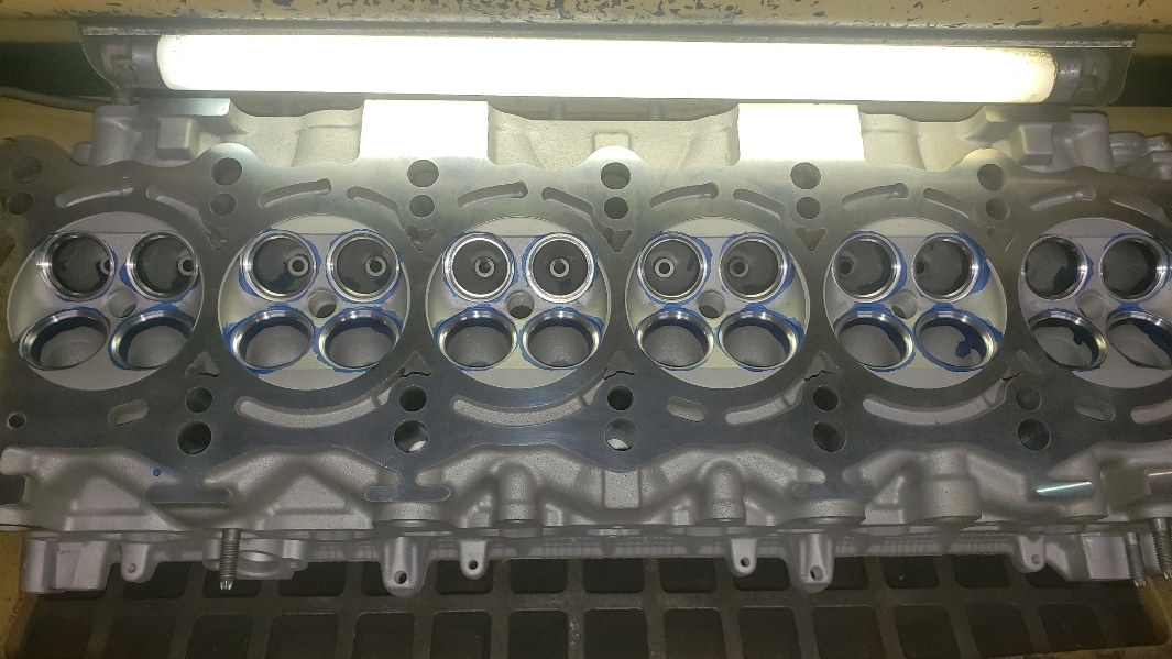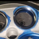 Here are some pics of an aluminum inline six cylinder Toyota 2JZ cylinder head that we did a three angle valve job & surface to. We painted the valve seats with some blue Dykem before machining them so we could better see when they were cleaned up. A closer look at some of the pics shows how bad the seats were pitted & corroded. We mounted the head in our Tobin-Arp seat-and-guide machine & machined the seats with our three angle Sunnen valve seat cutters. For surfacing the surface, or deck, we mounted the head on our Rottler multipurpose CNC boring & milling machine. For all your engine & cylinder head machining needs please don’t hesitate to contact us. Jimmy@MotorMission.com